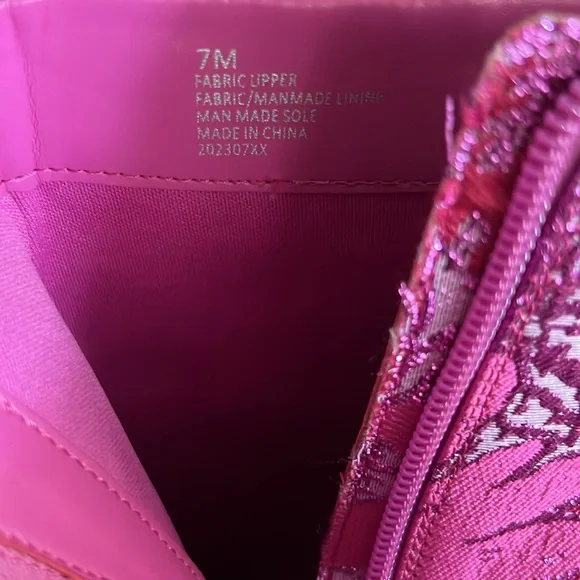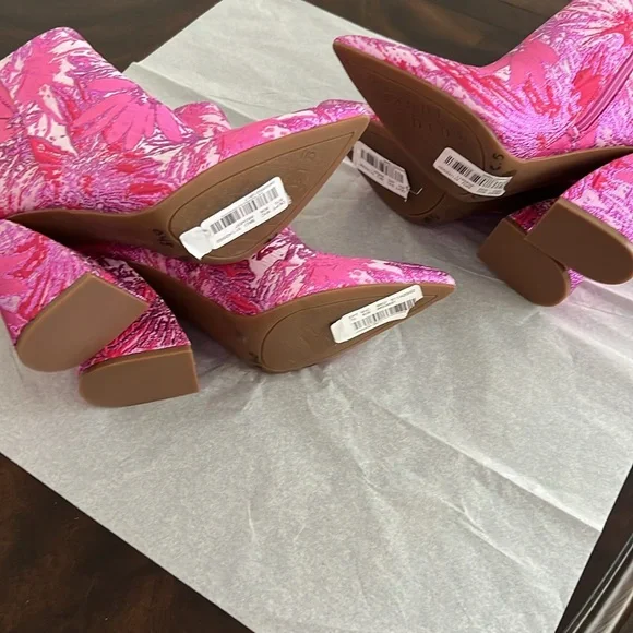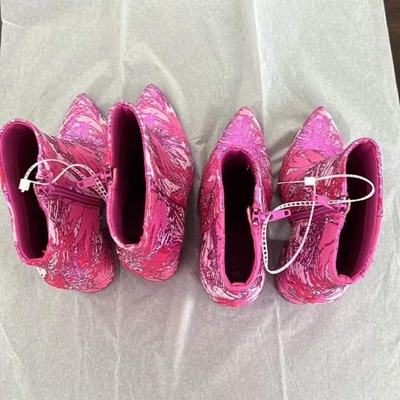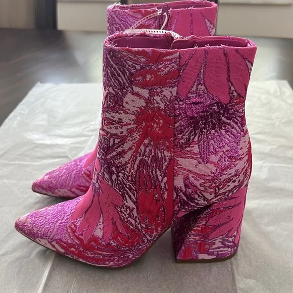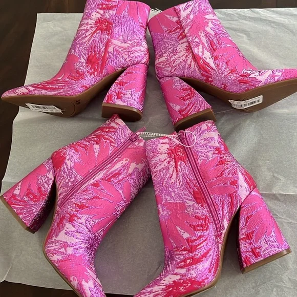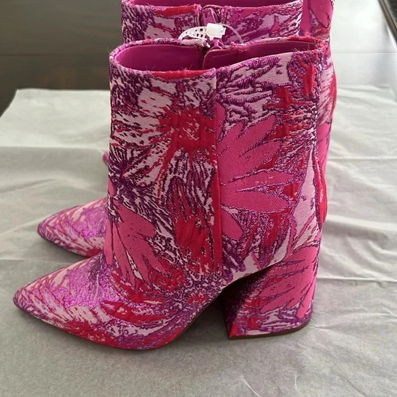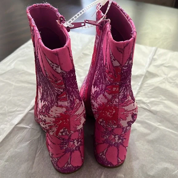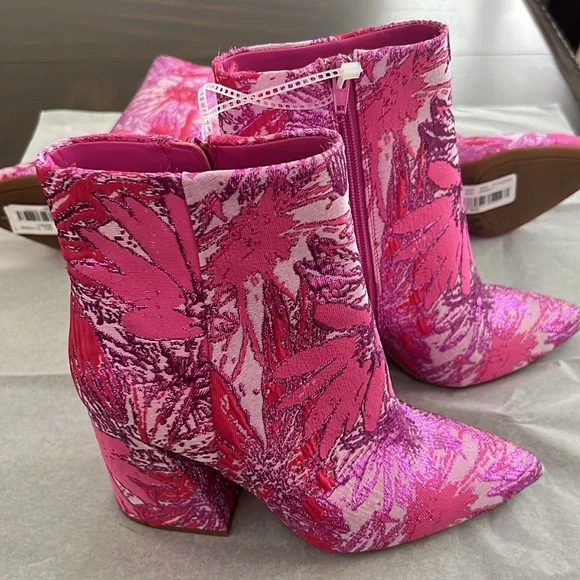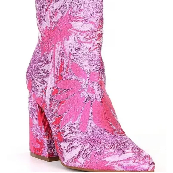 From Gianni Bini, the Callen Block Heel Booties feature:Floral burst printed brocade fabric upperSide zipper closureTricot fabric lining4mm memory foam sockRubber outsoleApprox. 5.9" shaft heightApprox. 9.84" shaft circumferenceApprox. 3.74" block heel heightImported.New without box with store markings at the outsole.
