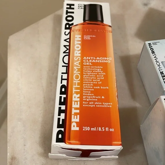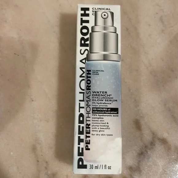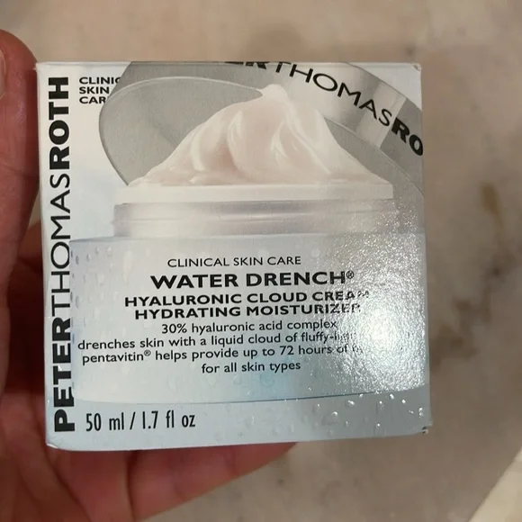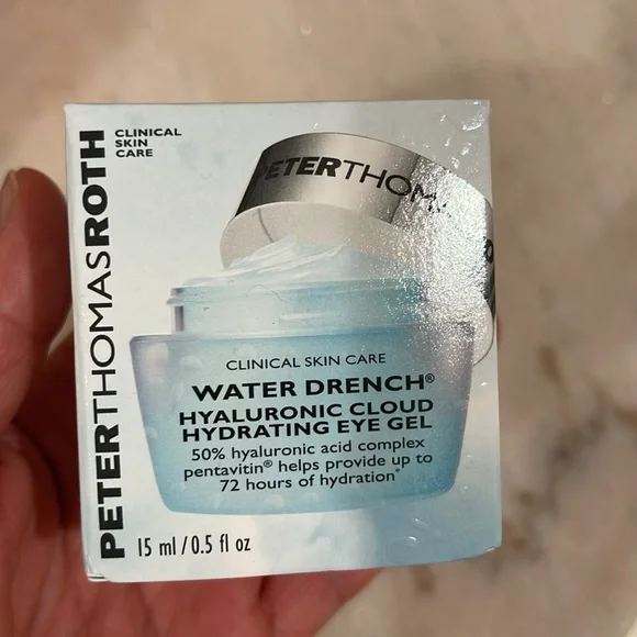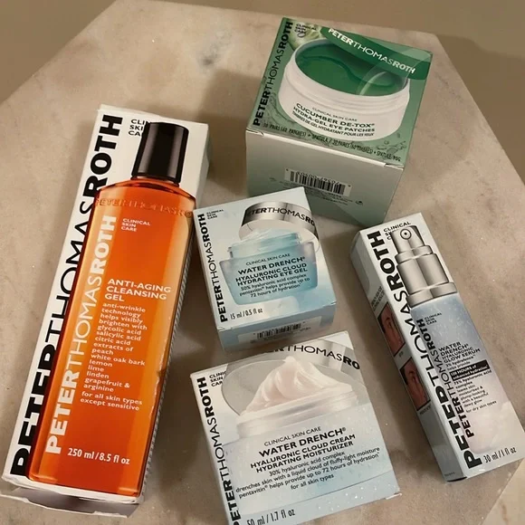 New in boxes, never used Peter Thomas Roth clinic skin care.Set of five includes:1.7 fl oz water drench hyaluronic cloud cream hydrating moisturizer .One 1 fl oz water drench hyaluronic glow serum.One 30 pairs (60 patches) cucumber detox hydra gel eye patches.One 0.5 fl oz water drench hyaluronic cloud hydrating eye gel.One 8.5 fl oz anti aging cleansing gel.